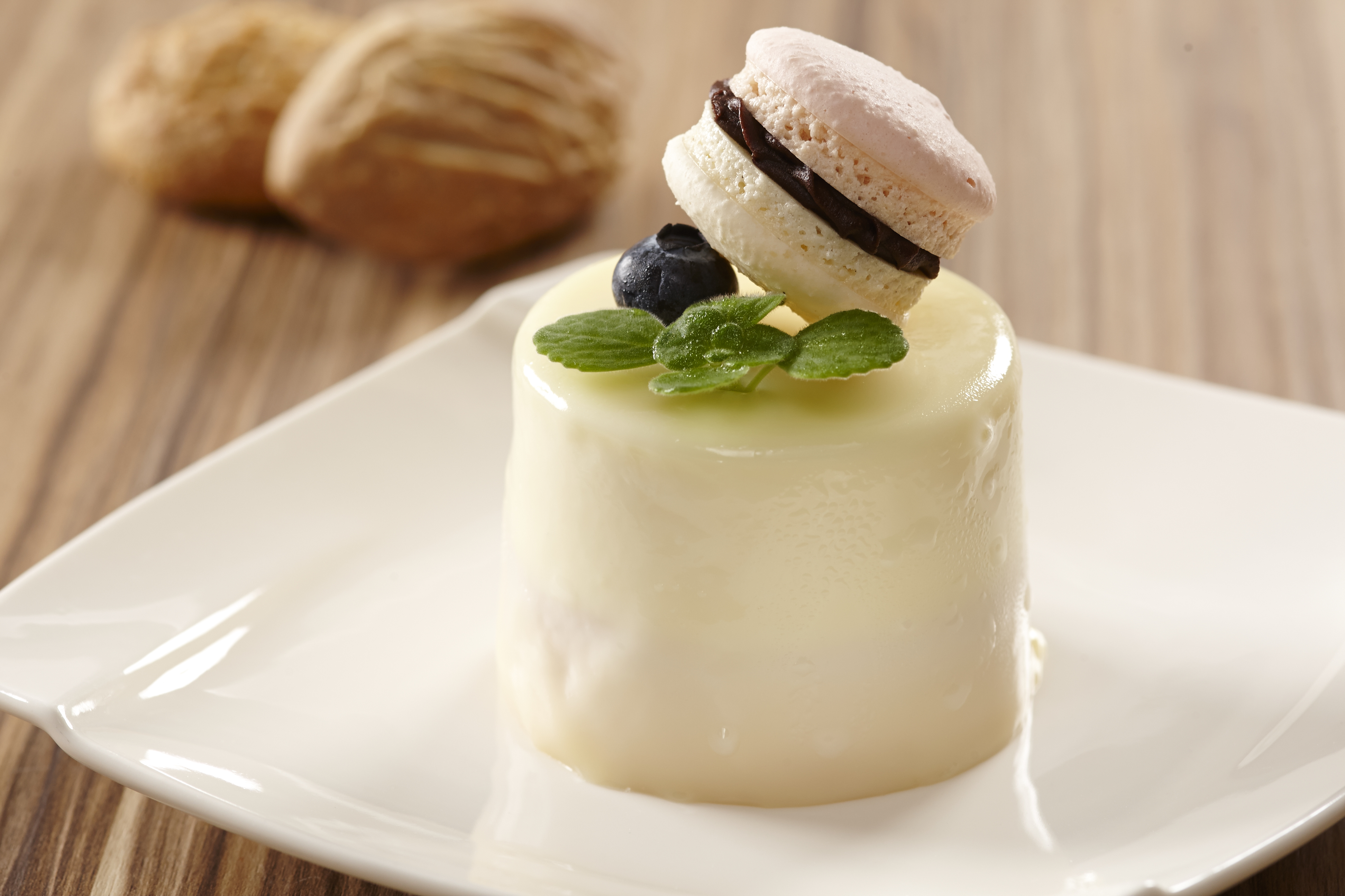 半 透明狀的白巧克力淋面,帶出優雅氣息,以優格與血橙慕斯帶出兩種不同風格的慕斯基底,加上海綿蛋糕,呈現出不同口感的表現,另外再加上巧克力覆盆子馬卡 龍,用甜菜根的帶出天然健康的甜味,最符合健康概感,如此不甜不膩爽口的甜點,又可為健康把關,有別於過去對於法式甜點的印象,清爽的口感又如小精靈在舌 尖跳躍!