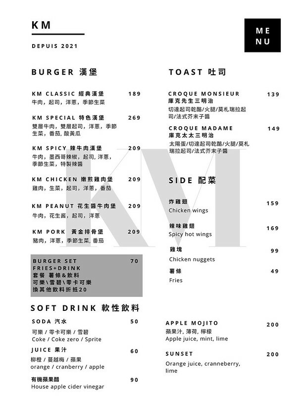 KM菜單以漢堡為主打,牛肉使用的還是金門在地產的酒糟牛,非常有在地特色,除了經典肉類漢堡,也還有三明治、小菜等可點,有喜歡的話,都可以點來吃看看喔。點漢堡可以加$70升級成套餐,會多了一杯氣泡飲料和炸薯條,如果不喝氣泡飲料,可以折抵$20換購其他飲品。(物價波動大,菜單品項及價格以餐廳粉絲頁公告為準)