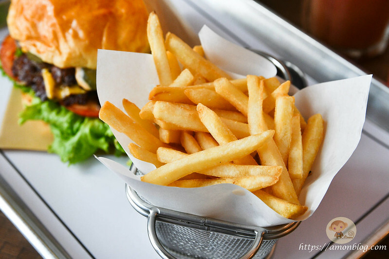 這是KM的招牌漢堡,第一次來不知道要吃什麼的話,直接點這個準沒錯,漢堡內有雙層牛肉、雙層起士、洋蔥、生菜、酸黃瓜、蕃茄等,牛肉用的還是金門當地的酒糟牛,這漢堡光是用看的就讓人口水直流,再加上那誘人爆表的香氣,拍完照就立刻大口大口的吃下肚,牛肉咬起來是有肉汁的,口感紮實且帶有嚼勁,配上蕃茄和酸黃瓜,更是讓人嘴巴停不下來,默默的就嗑完一個漢堡,這牛肉真的很有水準,強烈推薦必點,不愧是招牌菜阿。