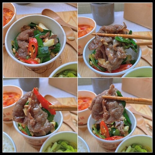 (葱爆牛肉。蕃茄炒蛋。炒娃娃菜。白米飯)