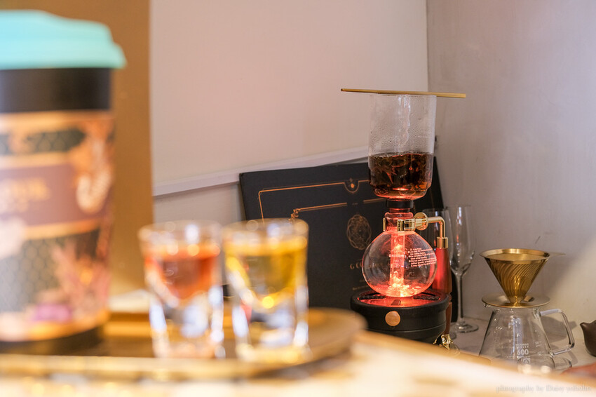 G colour金色魔法的現場菜單,就像一本魔法書一樣,深色的配色與金色的設計,很有魔幻感。而第一次來要喝什麼呢?看著菜單上有看沒懂的飲料名稱,像是維納斯謎境、甜心公爵紅、砒霜美人紅惡魔眼淚、火舞情人等,建議可以告訴店員自己喜歡的純茶、果香、花香等特色,接著直接請店員推薦適合的茶飲比較快。