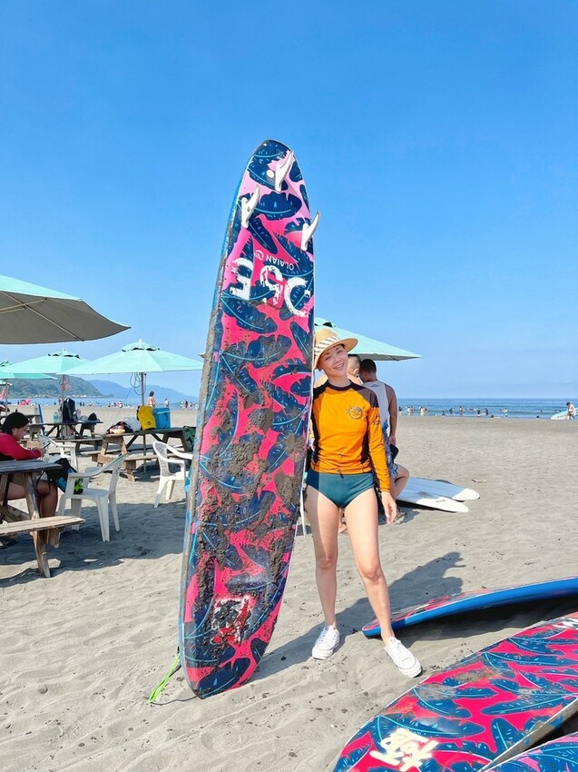 從來沒想過第一次衝浪就成功,那種快感與開心說不上來,它會讓你一次再一次的想突破,要不是最後浪太大進去有點難,婗媽待上半天也可以,而且,原以為會被曬到頭暈,待在海裡卻完全不覺得熱,即便跪浪、坐浪、趴浪,被浪推的感覺也很好玩,連阿婗都說我很厲害,坐在海上也能自嗨!其實我也不知在開心什來的。