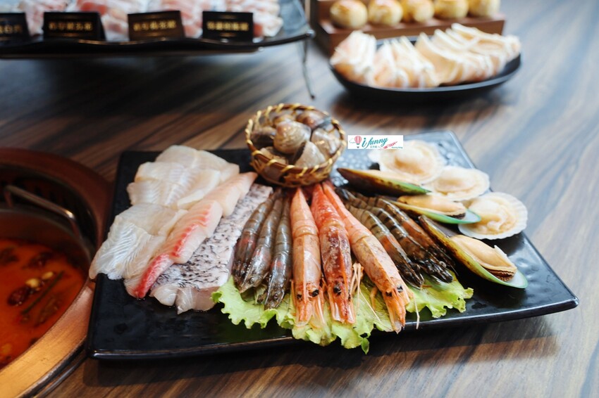 整個海鮮盤裡種類豐富,有天使紅蝦、海蝦、鯛魚、海鱸魚、扇貝、孔雀蛤、蛤蠣,這些新鮮的食材,煮完後除了鮮味入口之外,更能讓湯底的鮮度更加深厚。