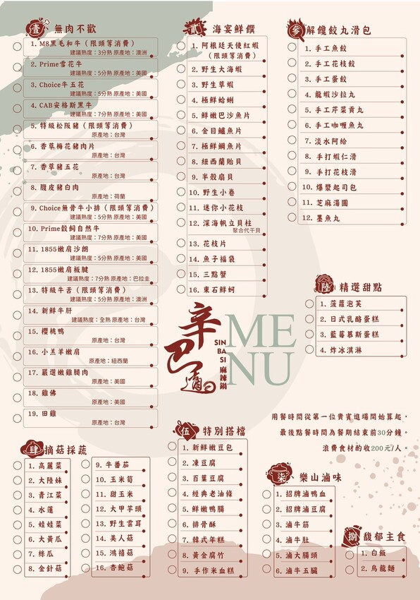- 限2人以上開鍋,一人用餐酌加收NT$100元。用餐時間110分鐘(自第一人進場起計時)最後點餐時間為餐期結束前30分鐘,浪費食材收NT$200元/人