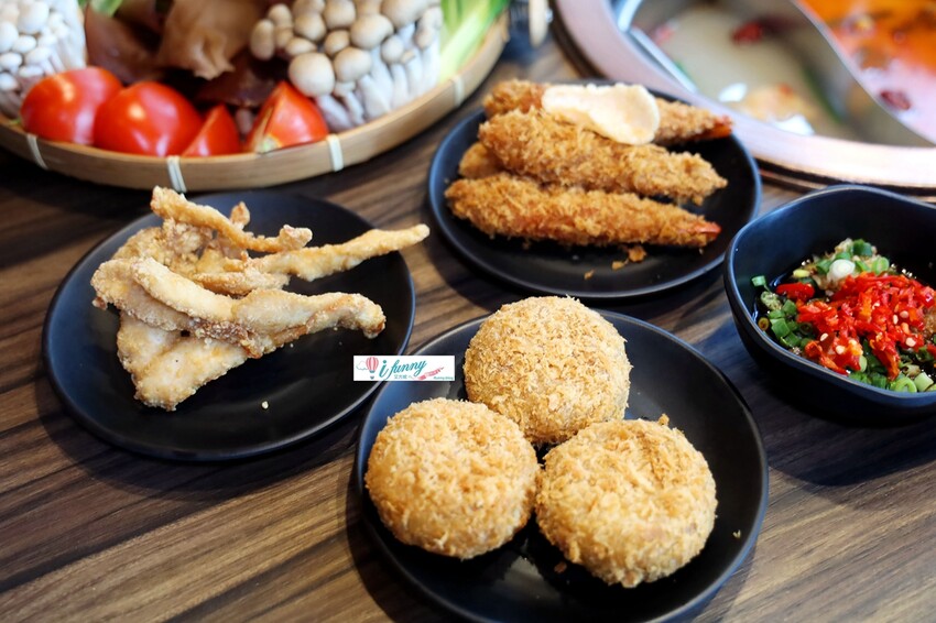 等火鍋滾的時候,可以先以炸物來開胃一下,炸魚條、炸蝦及咖哩可樂餅。還備有塔塔醬可以搭配喔。