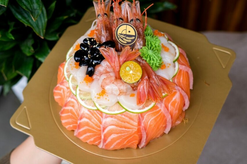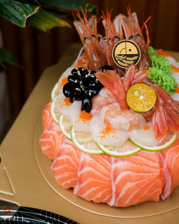 ▼擁有浮誇視覺的鮭魚刺身蛋糕,以醋飯組成蛋糕主體, 外圍再鋪上現切的生食級鮭魚、干貝和甜蝦刺身,挖上一口醋飯,再搭配厚實的炙燒鮭魚,滿嘴都是滿滿的鮮美油脂香氣,可以沾上店家提供的金蘭醬油,更可以凸顯出海鮮食材的甜味~