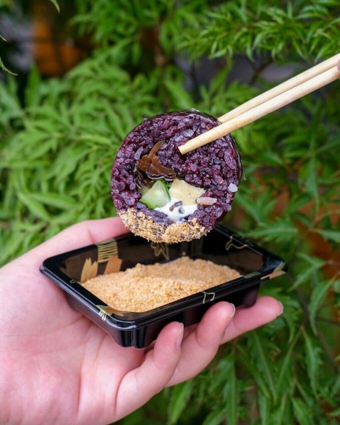 ▼其中我最喜歡的是美式炸雞捲壽司,酥嫩炸雞面點綴的美乃滋和洋蔥,酥脆帶軟的口感讓人滿足,另外紫米壽司也讓人印象深刻,粒粒分明的紫米沾上花生粉有夠特別;炙燒稻禾看起來則像常見的豆皮壽司,裏頭卻藏有細節,吃起來帶有炙燒過的美乃滋香氣,跟頂頭甜甜的豆皮相當搭配。