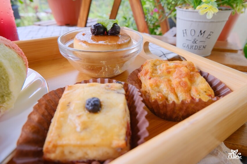 套餐除了彩虹蛋糕、焦糖布丁蛋糕、一杯飲料(任選),還可以選兩個口味的司康,司康外酥內軟不會太乾,有包餡口味很特別!口味有8種喔!
