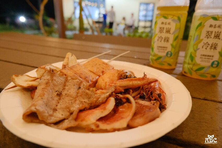 把烤好的餐點端到涼亭桌,搭配黃光很有氣氛吧,上山不用自己準備食材真是太方便了!