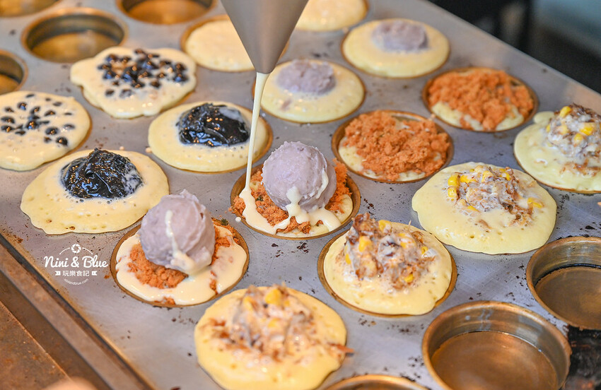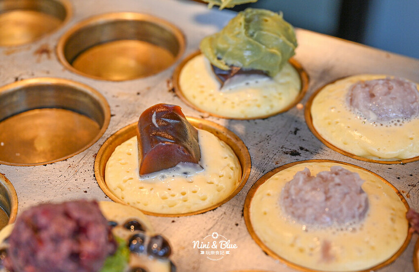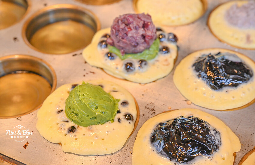 雖然笨妹日式菓子燒製作時間不短,但妮妮布魯很喜歡看現場製作的畫面,即使光是等慢火將餅皮烤到全熟要花不少時間,但看到烤盤滿滿和各種奇特餡料的時候,真的很誘人食慾啊! 這個也想吃、那個也想試看看~