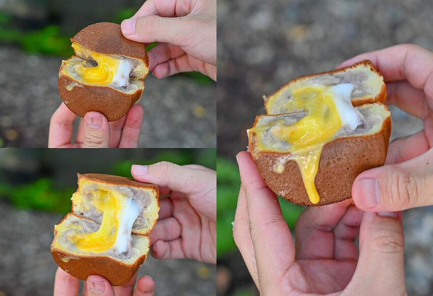趁熱的時候,中間牽絲的麻糬有點半融化狀態,中央的鹹蛋黃更是會爆漿出來~吃的時候千萬小心燙口啊!!