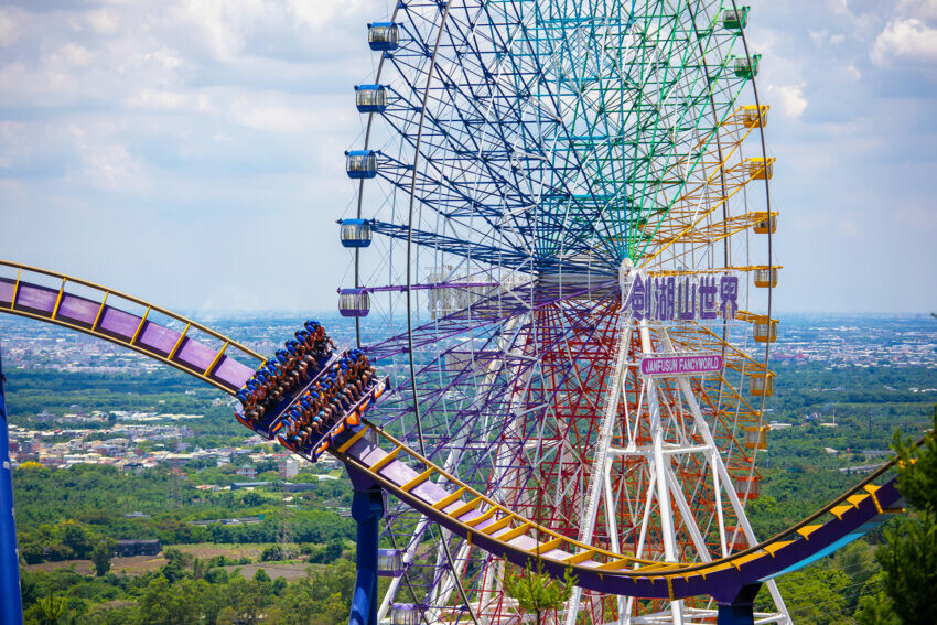 無論從園區的哪個角度都能夠看到這劍湖山世界的招牌「幸福摩天輪」,位居摩天廣場的顯眼處,總體高達30樓層高,從制高點居高臨下除殼惡以俯瞰整格園區的美貌以外,另一面的嘉南平原風采也是一大看點。另外值得一提的是到了跨年時這座摩天輪可是扮演著主舞台的角色,在陣陣的倒數聲中,綻放出新年新希望的花火,是台灣重要的跨年聖地喔!