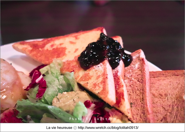 佐上藍莓醬很是對味!不喜甜膩的朋友也別擔心,還有另附上一盅奶油抹醬喔!