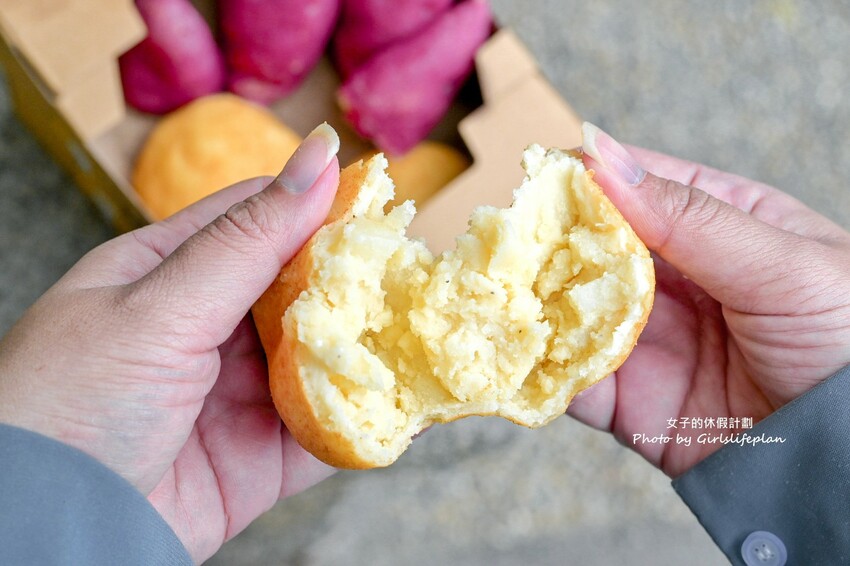 外觀看起來有夠像剛出爐還熱呼呼的紅薯,撕開一半也超像,口感我原以為是麵包,但吃起來像是吃麻糬帶著Q彈感,挺讓我驚豔的,地瓜內餡非常香甜呢。