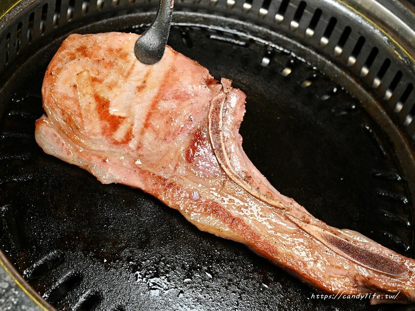 採用台灣冷藏豬的里肌或是前腿上的梅花肉連著豬肋骨切出的部位,一次可以吃到兩種口感,知肉極緻韓燒肉的大戰斧豬排沒有醃製過,直接以原塊肉下去烤
