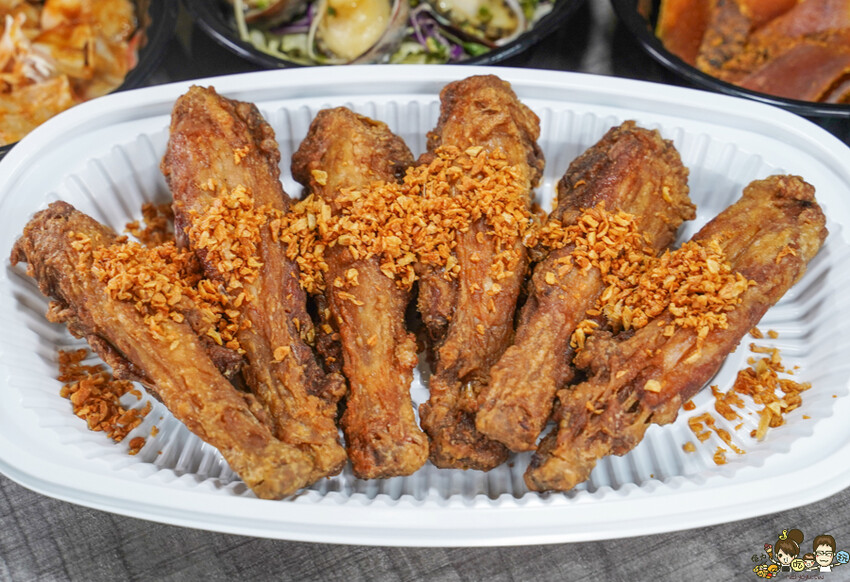 很肥厚的金錢骨,油炸金黃酥脆、撒上自家特製蒜酥,搭配吃增加鹹香蒜味