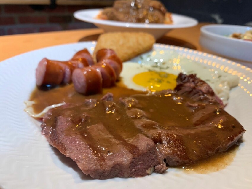 今天我點的是牛排早午餐,我覺得非常划算!有一大份牛排、一碗沙拉和超好吃的法式吐司!!