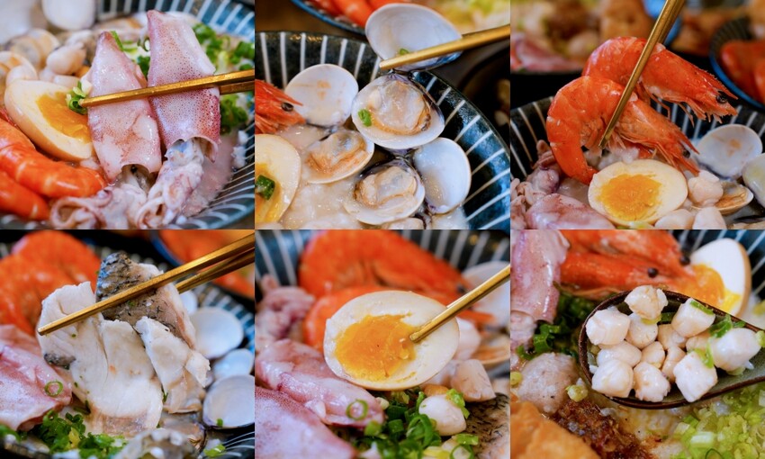 ▲極品海鮮粥的內容物有小卷、蛤蜊、鮮蝦、鱸魚、溏心蛋,還有額外加點了一份小干貝!海鮮粥可以吃到各種海味食材的鮮甜及雞湯的精華~是比較清爽的粥品口味!
