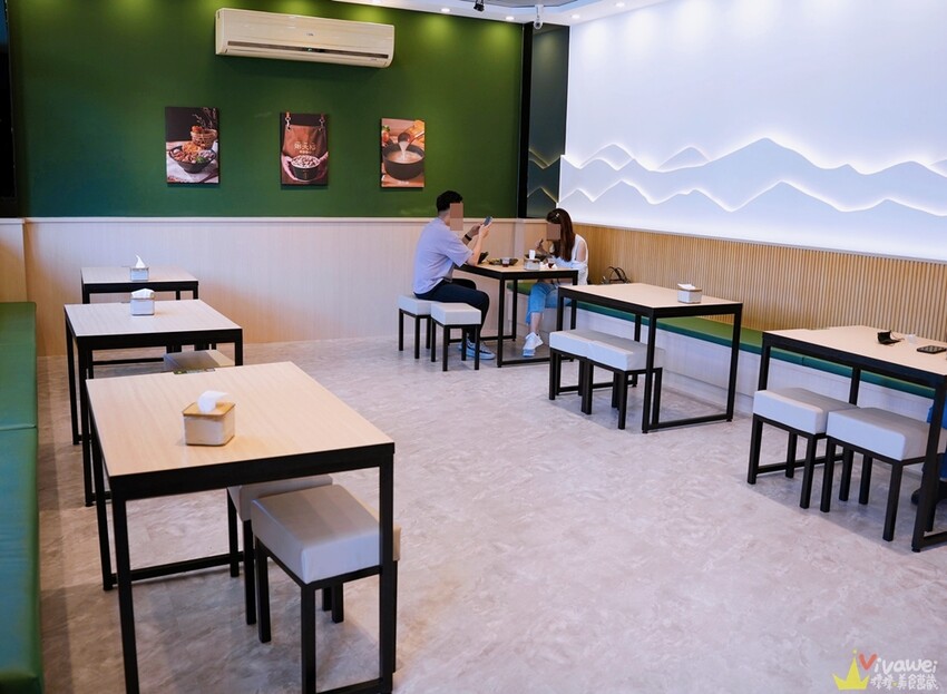 ▲ 「粥大福-頭份建國店」內用的座位空間很寬敞,牆面上的山景更是充滿高級仙氣感!比較可惜的是座位數不多,當天在平日下午一點抵達店內是全客滿的狀態,我們等了一陣子才有空位呢!生意非常好!