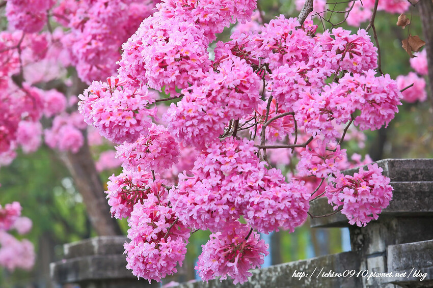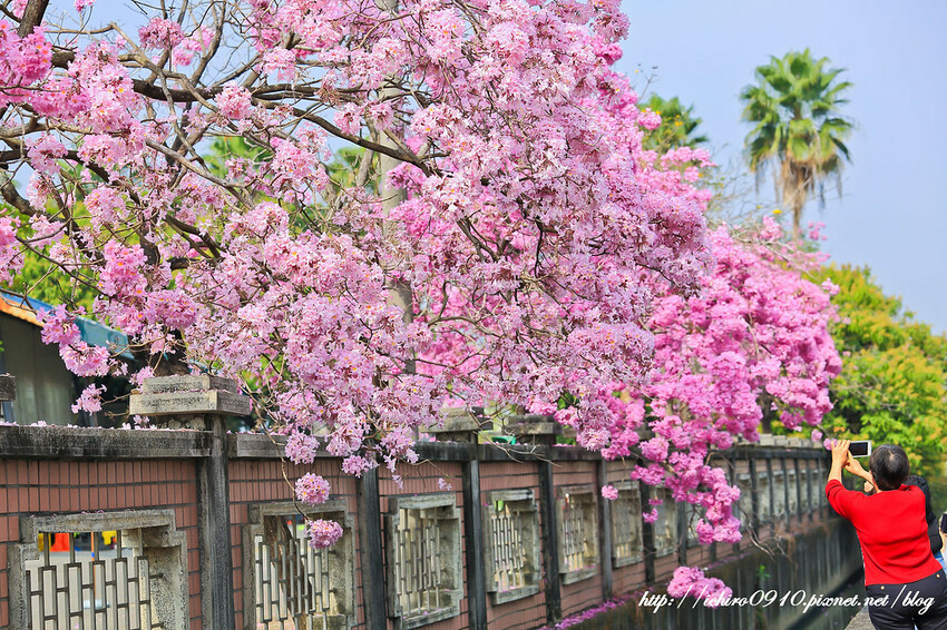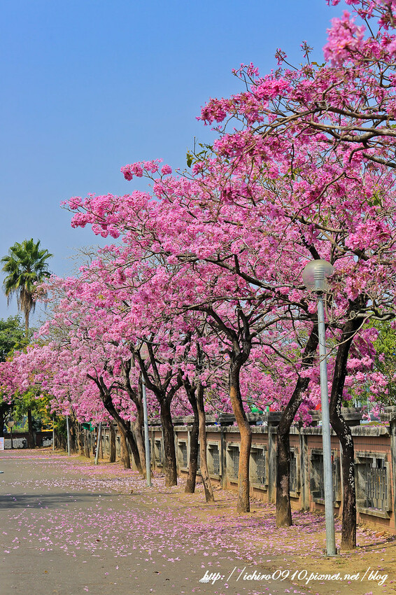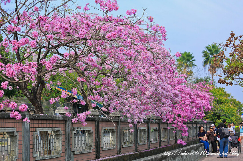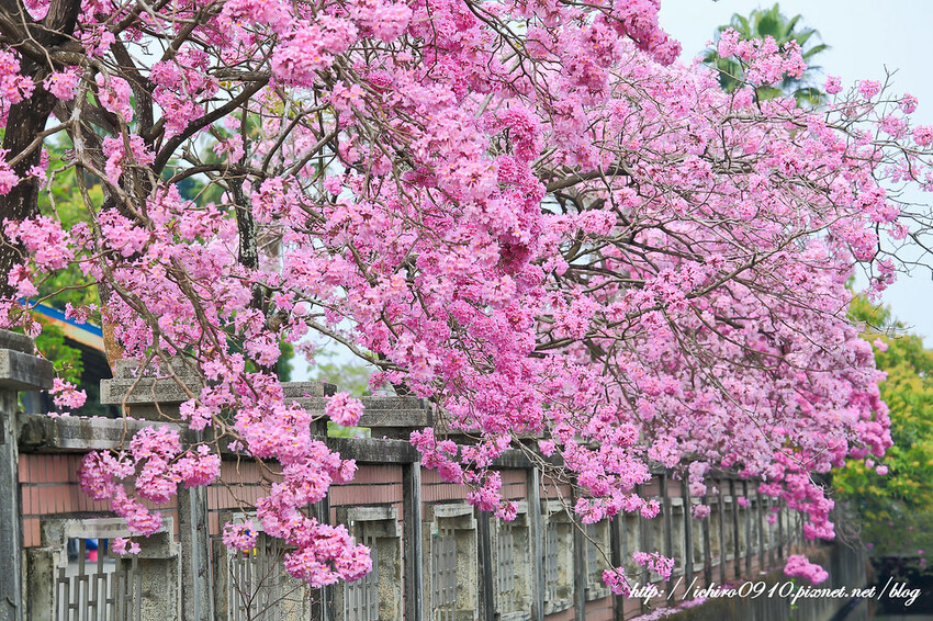 學校外牆整片洋紅風鈴木,壯觀且迷人
