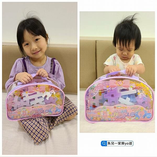 整套積木採用亮粉與珠光色系,以及花、馬、王子、公主人偶等配件,可以拼出馬車、花朵、皇冠、城堡等小女孩最愛的物件,不但滿足小小魚的公主夢,還能滿足小小魚愛演戲的心,拚完物件就拿來逼我陪玩角色扮演的遊戲了。