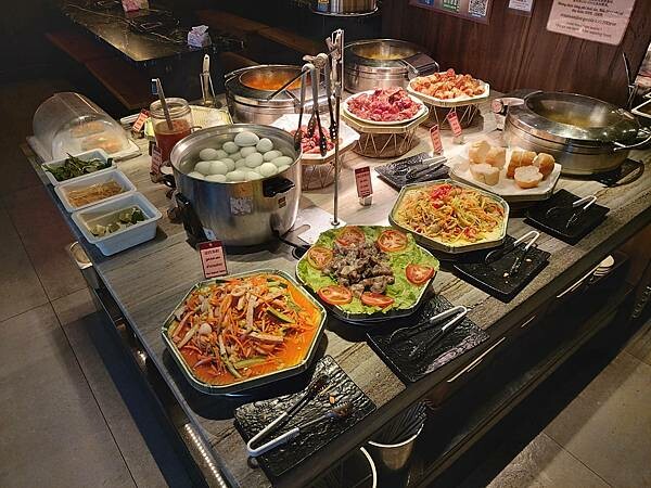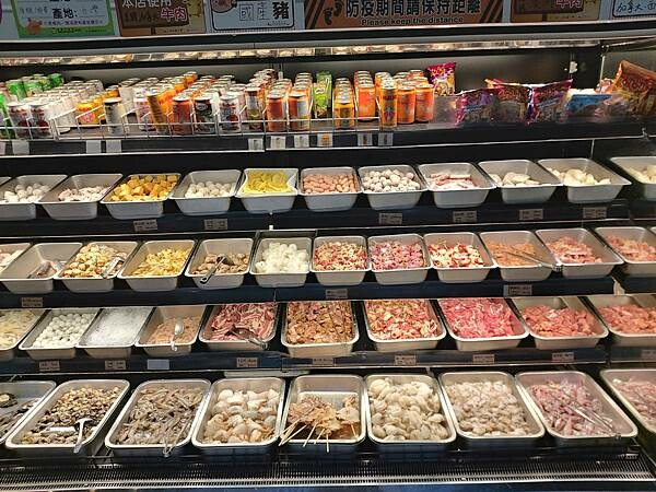 各種燒烤跟火鍋食材,擺得很豐盛,還有一些水果、沙拉、泡麵跟罐裝飲料