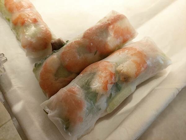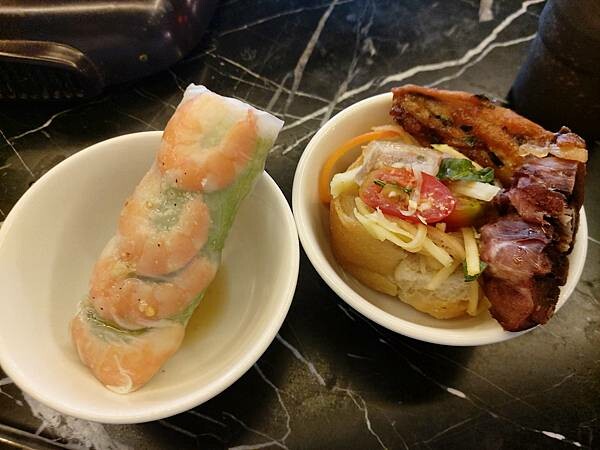 ▼越式生春捲-裏頭包著烤三層肉、鮮蝦、小黃瓜、米線和些許薄荷葉提味,沾上辣椒和魚露,最後擠上幾滴檸檬汁,吃起來相當清爽