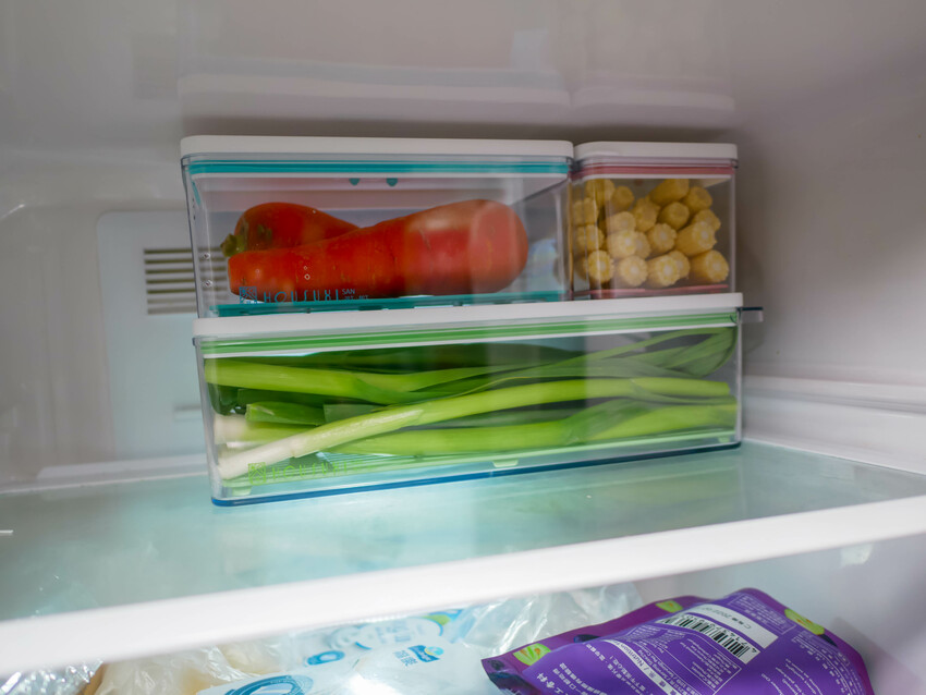 食材能保持新鮮乾淨衛生,能自由堆疊保鮮盒完美收納於冰箱!