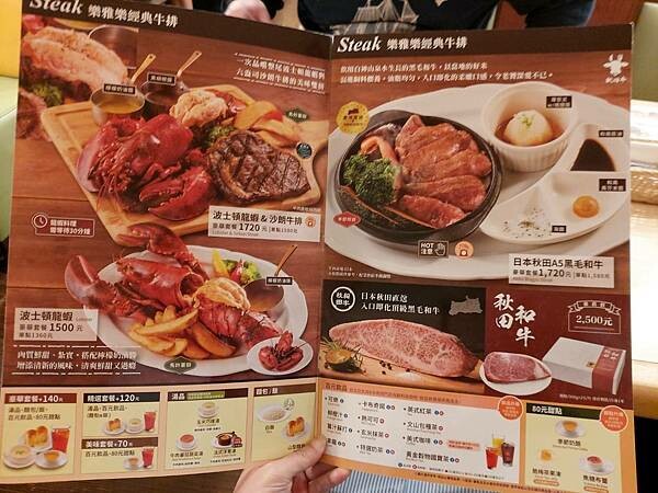 餐點包含經典牛排、和牛漢堡排為主、各國料理、和風御膳、咖哩、沙拉及冰品、甜點