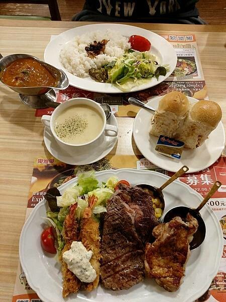 沙朗牛排、多汁香料雞排與洋食炸蝦,3種肉品一次滿足(牛排:180g/後頭有黑胡椒醬跟奶油玉米粒)