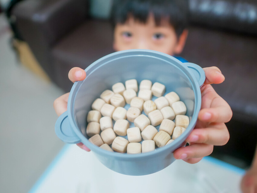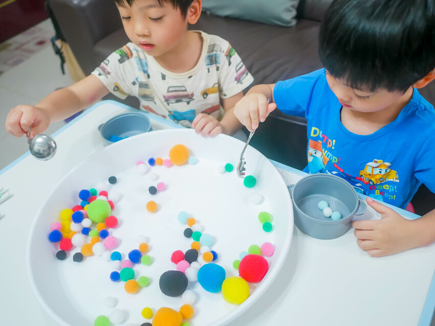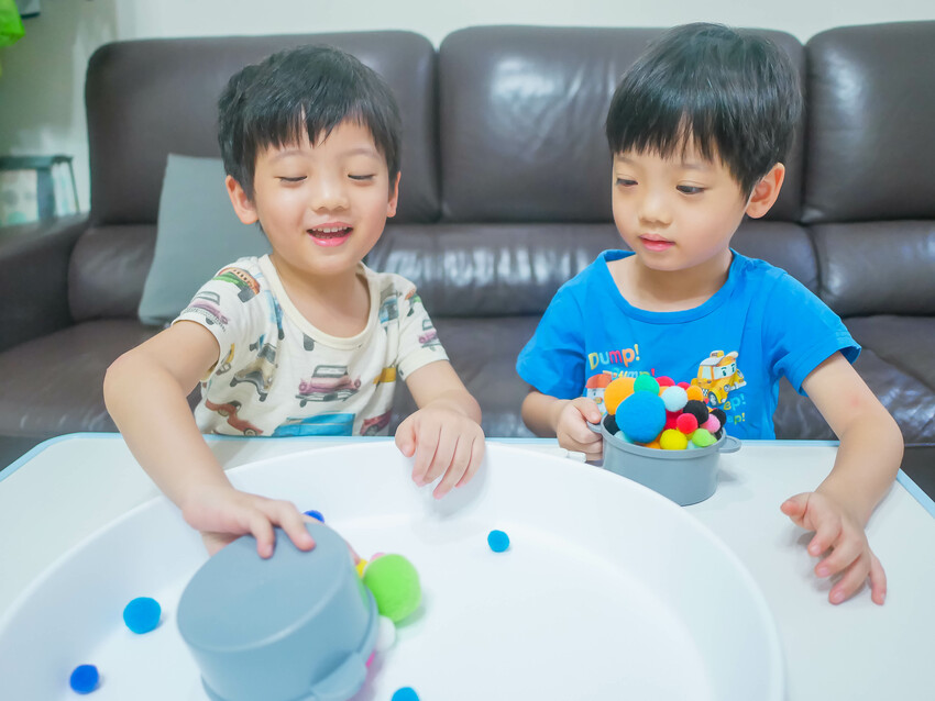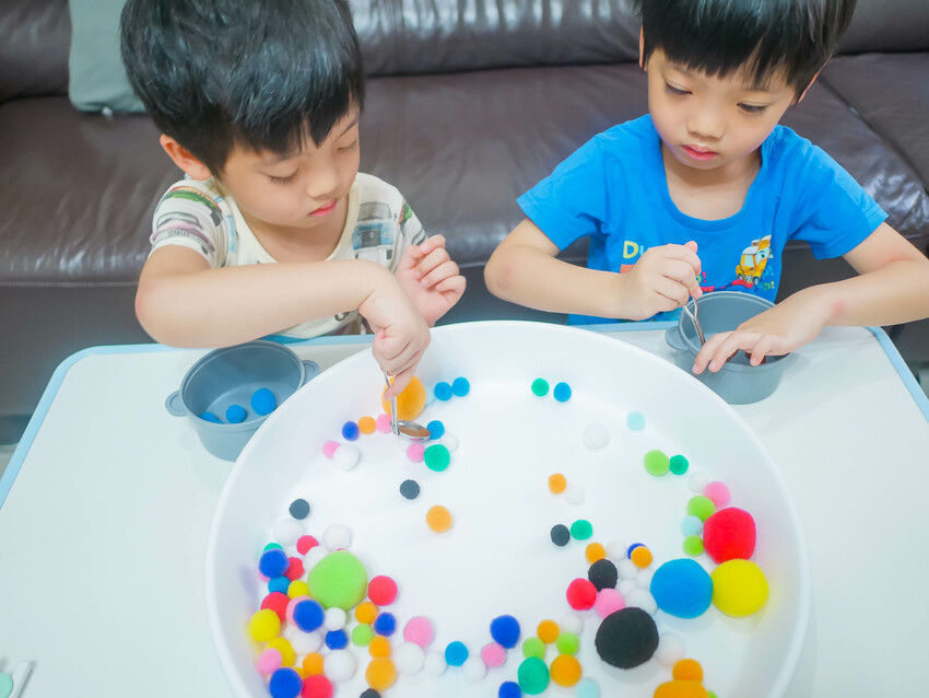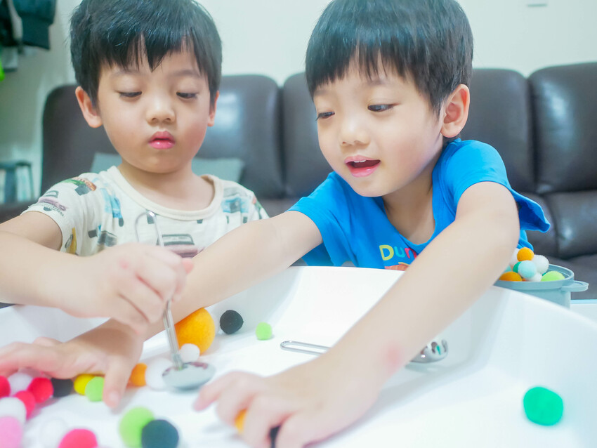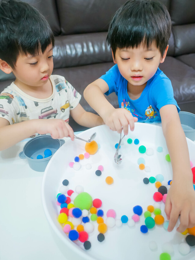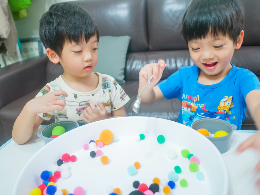 可以讓孩子使用筷子夾起毛球,訓練孩子的手部小肌肉發展