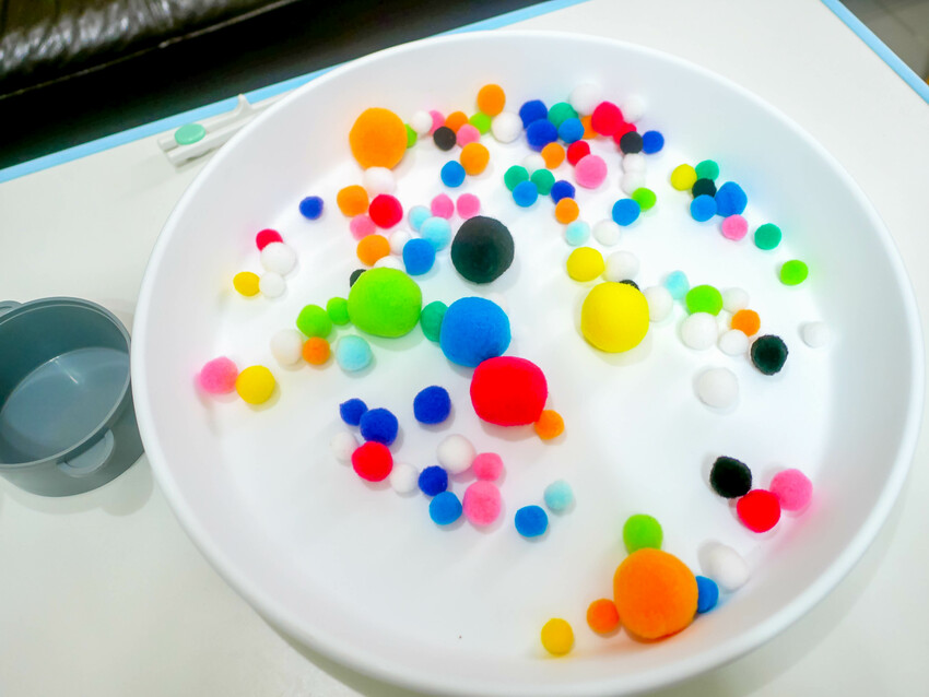 將澎澎毛球倒入感官盆中,準備一雙筷子就可以開始遊戲囉!!