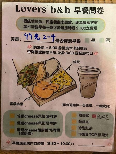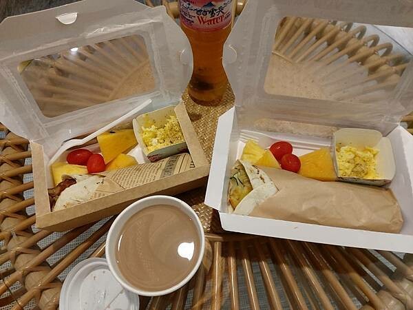 當日手作的Taco餅有三種口味可以選,疫情期間原本吃早餐的空間未開放,改由餐盒方式送至房間,時間可以自選