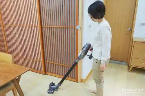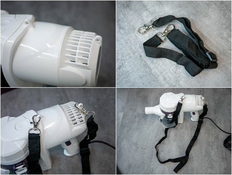 實際使用起來,因為有線連接少了電池,整體更為輕巧,搭配肩背帶的設計,不論是多角度使用或是搭配軟管吸頭都更方便