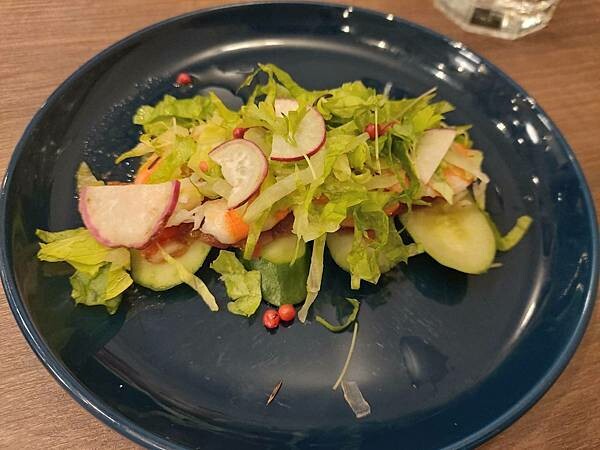 由白蝦、蘿蔓、小黃瓜、櫻桃蘿蔔、檸檬、莎莎醬所組成,是道清爽的前菜