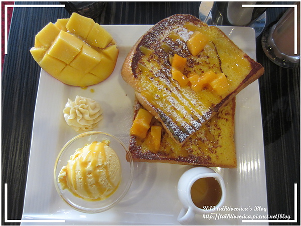 兩片布丁土司,就是法式土司的口感,上面有切丁的芒果點綴