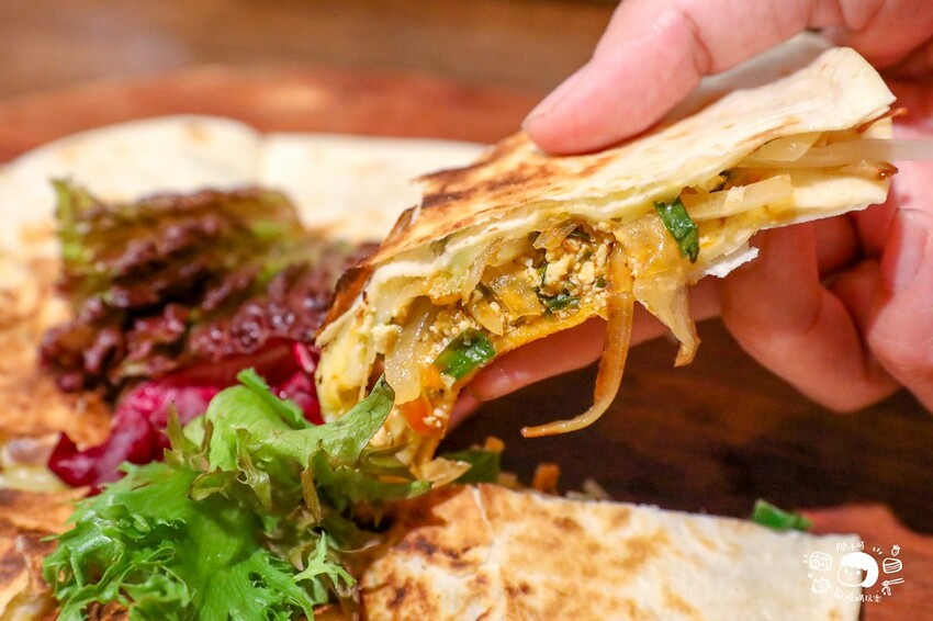 外層酥軟,內餡川味豆腐以毛豆、紅蘿蔔、洋蔥和香菜拌炒,主角是拉差辣椒醬讓薄餅又酸又辣,超開胃。