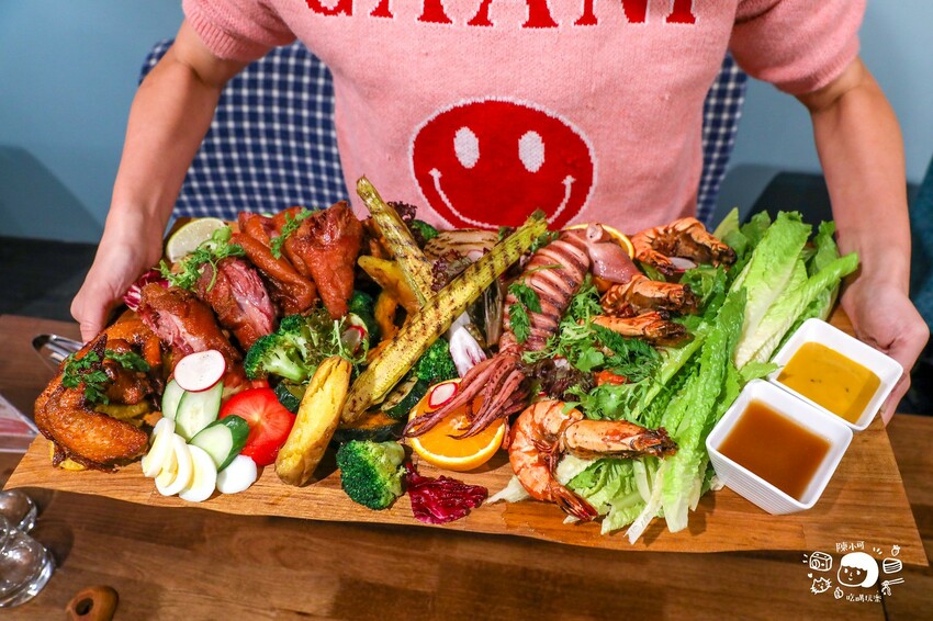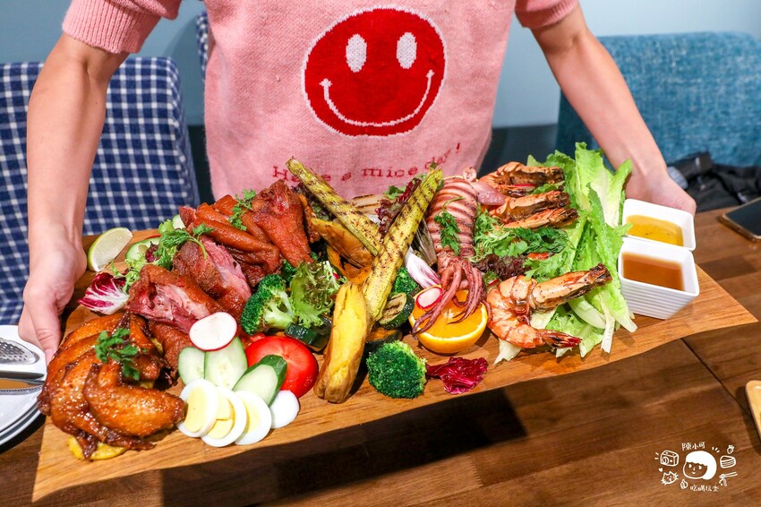 真的會讓人拍不停的網美餐,好拍又好看,整隻烤魷魚份量就不少、還有烤雞翅、德國豬腳、大蝦加上五顏色六的時蔬和水果,一次吃到多種食材。