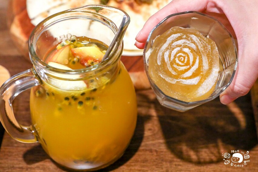 很大一杯水果茶,裡面有不少新鮮水果,連鳳梨和蘋果還有熬煮過,味道好甜好吃,比之前更厲害的是多了玫瑰形狀的冰磚,超用心的~
