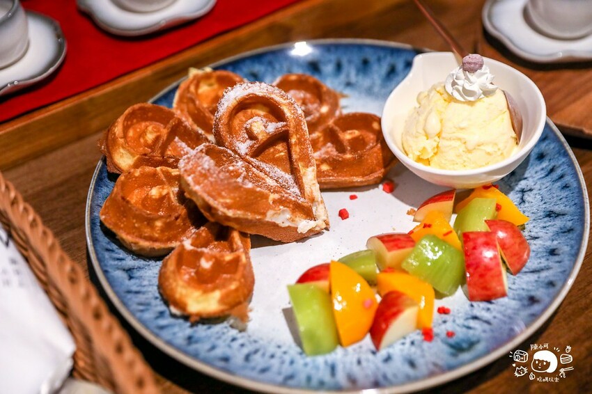 酥脆的鬆餅裡面還加了麻糬,外脆內軟Q,旁邊還附有香草冰淇淋及新鮮水果,餐後很適合來一盤加分的甜點。