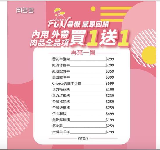 ●活動時間: 0701起 – 0831止(即日起至8月底全台門店暑假限定推出買一送一,肉品全品項 買一送一,內用外帶通通都適用喔!)
