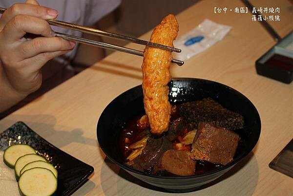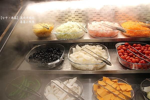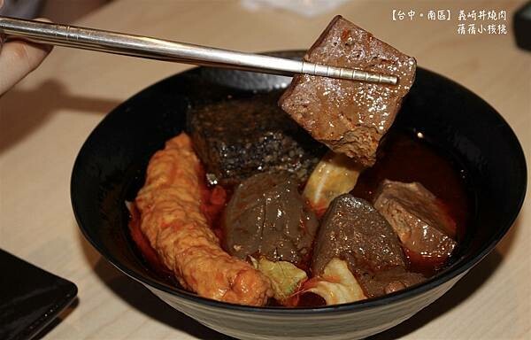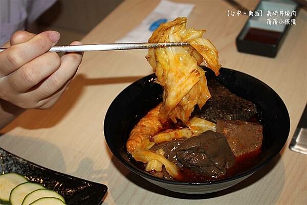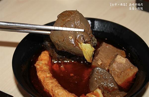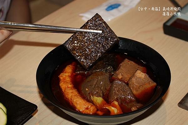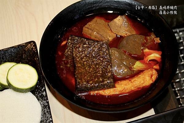 滿滿一大碗的麻辣鴨血豆腐,是艾琳點套餐以+99元加點的,這是台中南區燒肉~義崎丼的招牌必點菜單,裡頭有艾琳最喜歡的米血、鴨血豆腐、黑輪和高麗菜,超豐富的!