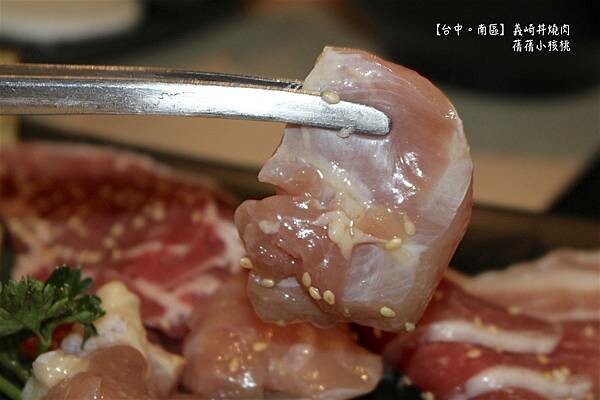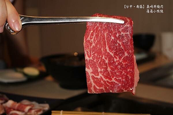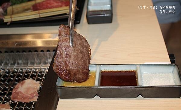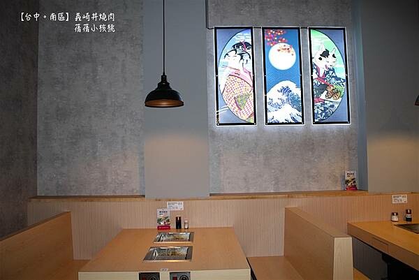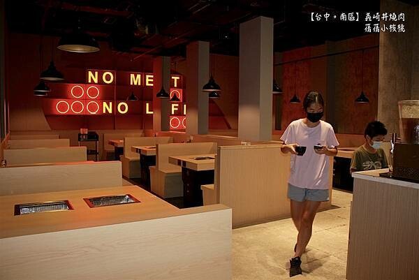 台中個人燒肉-義崎丼~店內是以清水模裝潢搭配配暖色系的燈光、沈穩的木紋桌椅,加上牆面上一張張有著濃濃日式風格的照片,打造出有著日式質感和極簡風兼具的現代空間,後方閃著大大NO MEAT NO LIFE的亮紅色燈光,詼諧中的不免讓人會心一笑,看著身旁愛吃肉的蒨蒨,用手指了指~沒有肉,沒有生命,這.......不就是最符合你的寫照嗎?