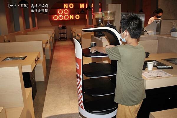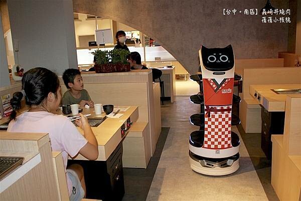 原來義崎丼燒肉是採用超萌貓咪送餐機器人,貓型超萌的設計,一出場果然艷驚四座,貓咪機器人會將餐點正確無誤地送到桌邊,再由服務員幫忙上桌,因為太可愛,小核桃還要求服務人員可不可以讓他把餐點端上桌。