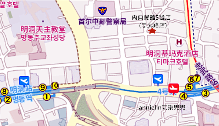 從地鐵4號線-忠武路站6號出口步行5分鐘,途經T MARK酒店時左轉直走便是!