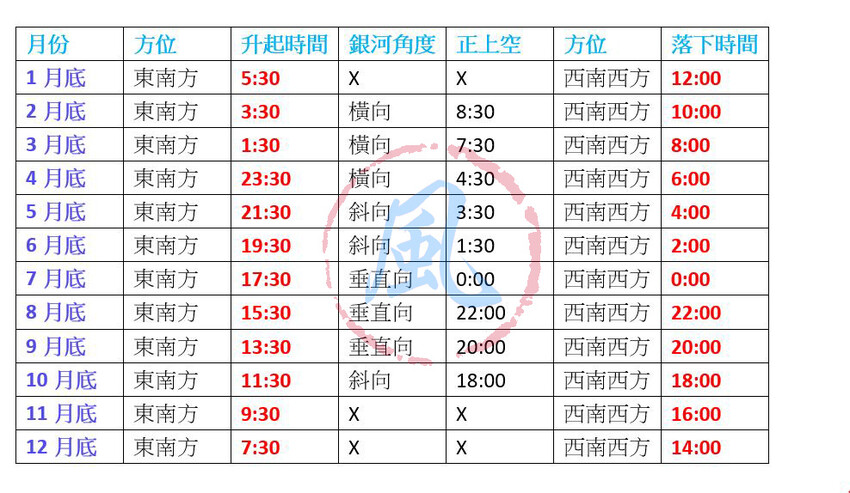 每年的1月、11月~12月銀河升起落下皆落在白天