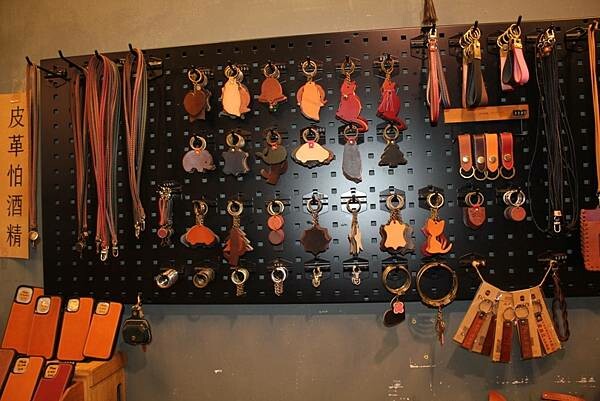 門口前的展示櫃展示著DIY的體驗內容,小至每天都會用到的鑰匙圈、皮革手環、髮夾、零錢包、鑰匙包、皮帶.......當然還有出門要帶上的皮包,艾琳才發現原來我們的生活早已充斥的美好的皮件,一回頭,喜歡皮革香氣的蒨蒨早已拉著小核桃進入店內,自顧自地逛了起來。