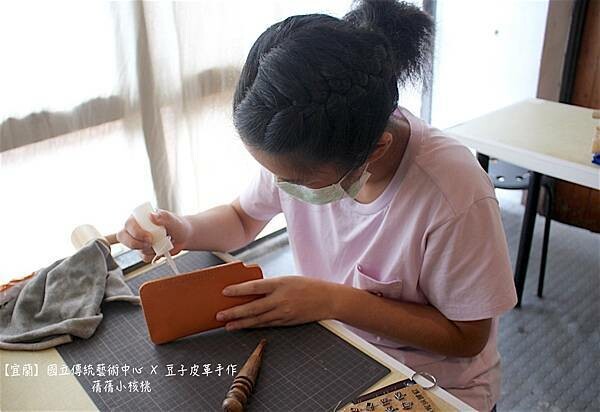 在蒨蒨專心DIY時,工作人員也很用心地講解了這個手機皮套的材質和日後的保養方法。