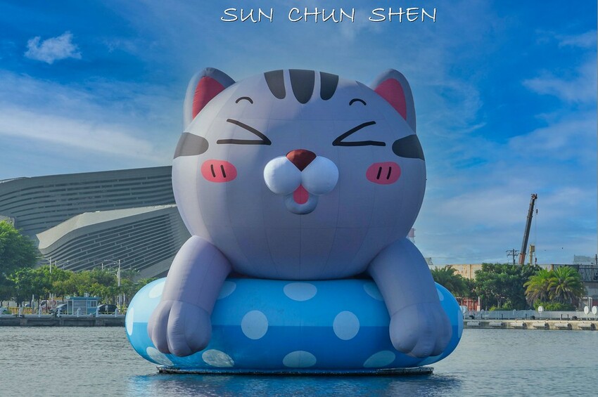 手持冰棒坐在游泳圈上、一旁有珍奶