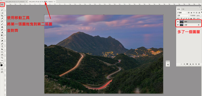開啟PS,將要疊圖的照片開啟(範例為兩張)
